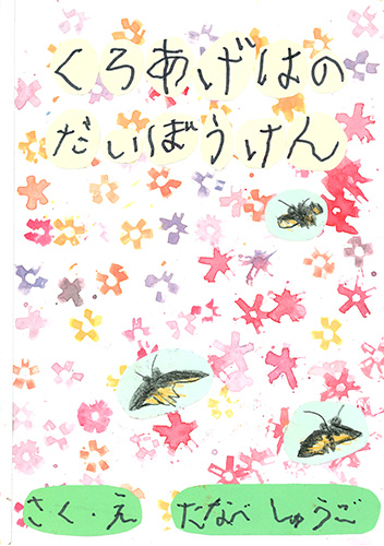 羽化したクロアゲハが空想の世界へ冒険する話です。修悟さん、アゲハチョウの成長をよく観察して絵をかきましたね。オクラのスタンプで表した菜の花畑はきれいですね。雨粒のスタンプもすてきです。クロアゲハが宇宙まで冒険して家に戻ってきました。きっと、アゲハチョウも修悟さんのことが好きなのですね。